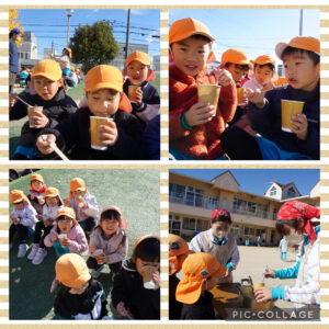 完成した味噌汁を3歳児は各クラスで、4.5歳児は園庭で味わいました。
